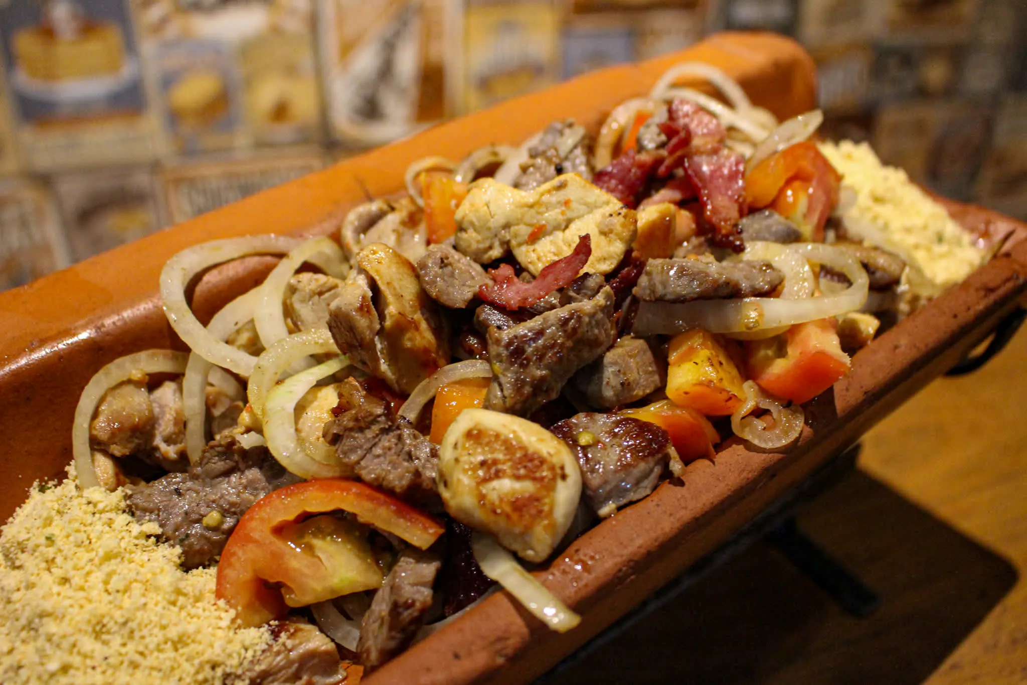Porção mista de carnes: Alcatra, Filé mignon do porco, Filé de frango, bacon, tomate,cebola.