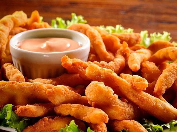 Filé de frango em tiras empanado e frito.